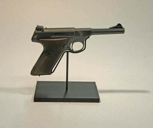 For mounting hand guns there are other options. Art Display Essentials carries a wood stand that has a post that goes into the magazine to hold the gun. Revolvers have a different type of wood stand that has a wood post on which the barrel rests. These can be seen here: